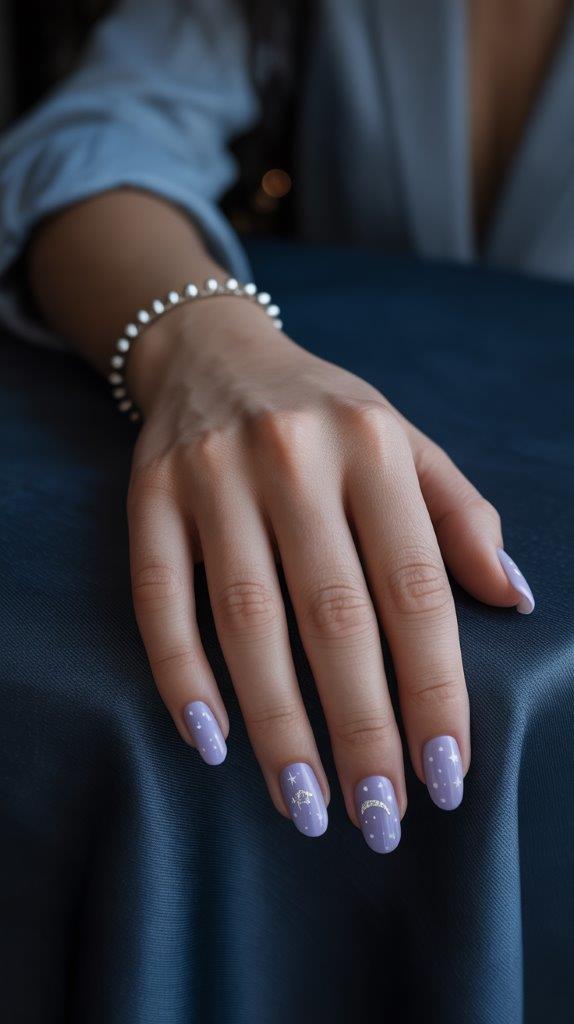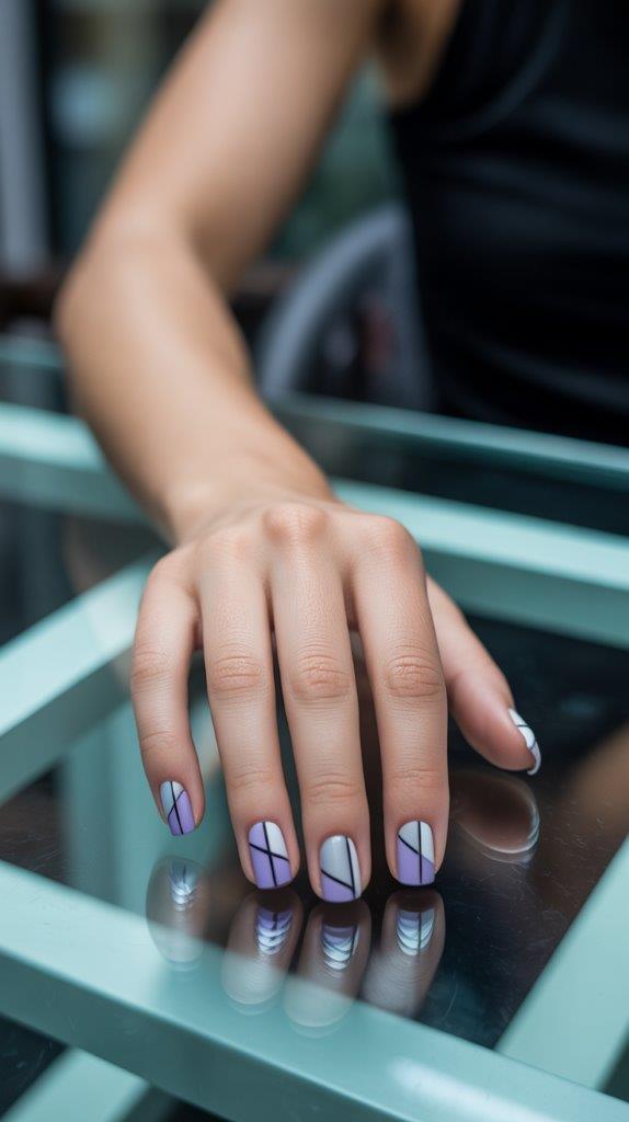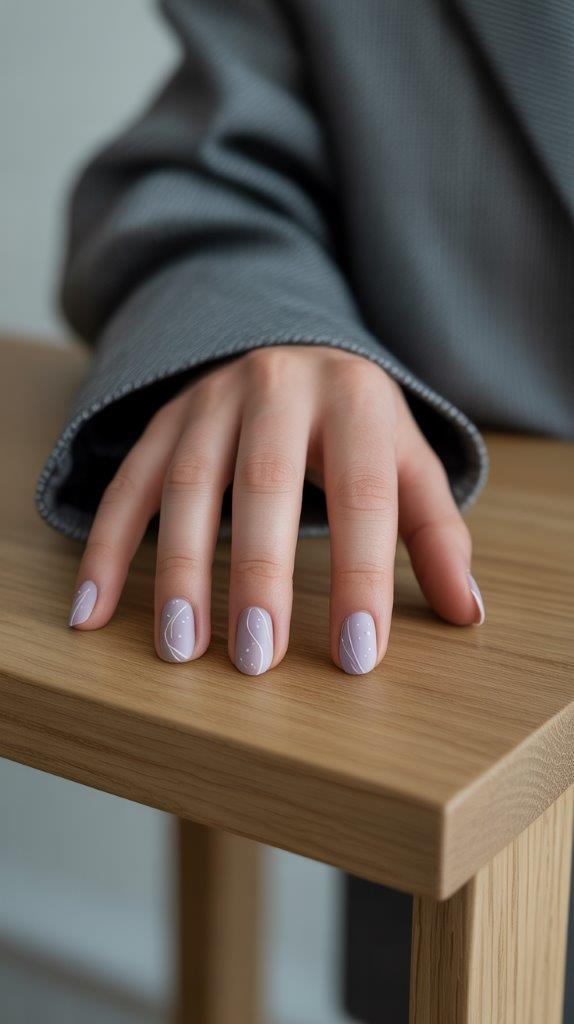 If your aesthetic is “less is more,” this one’s for you. Think thin, wispy lines, tiny dots, or abstract squiggles in white, black, or silver over your lavender base. It’s like modern art for your hands. The negative space keeps it feeling light and airy, letting that beautiful pastel shade really sing.
