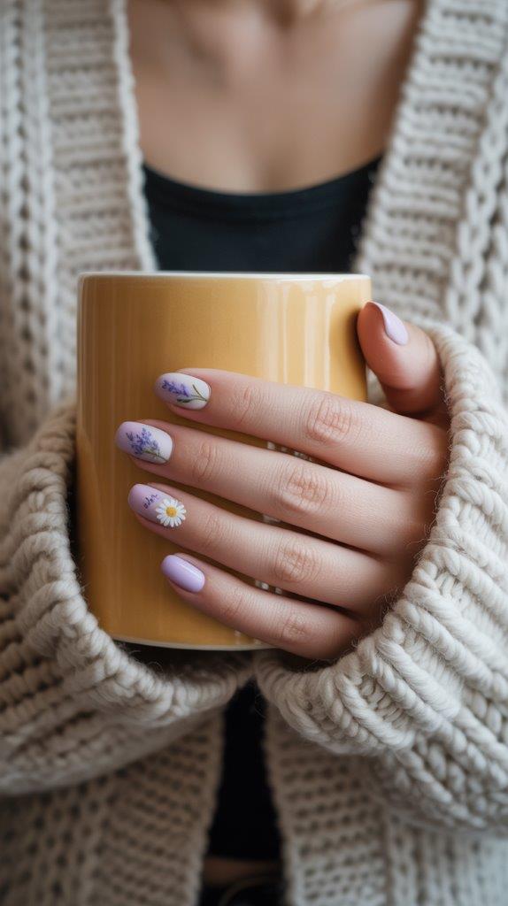Channel cottagecore vibes with tiny hand-painted flowers on one or two accent nails. Think little lavender sprigs, daisies, or forget-me-nots. Keep the palette soft—whites, greens, and slightly deeper purples. It’s a feminine, romantic take that instantly makes your hands look like they belong in a sun-drenched meadow.