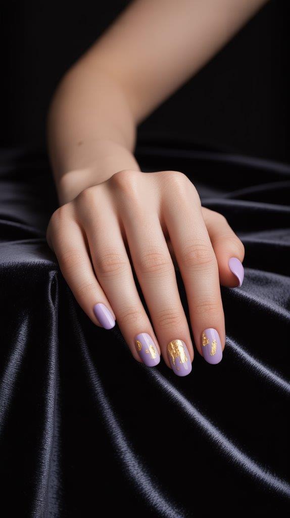 Add a touch of luxury with scattered gold foil. Unlike solid gold leaf, flakes feel more organic and textured. Press a few pieces onto a tacky base coat over your lavender polish. The contrast between the soft purple and the bright gold is unexpectedly gorgeous and ridiculously chic.