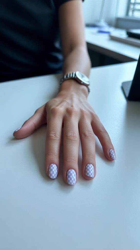 Checkered print isn’t just for skaters and picnic blankets. A micro-checkerboard pattern in white and lavender (or two shades of lavender) is a graphic, playful statement. You can do it on all nails or just as a bold accent. It’s fun, fresh, and proves pastel can be edgy too.