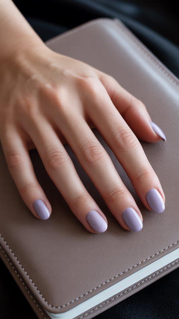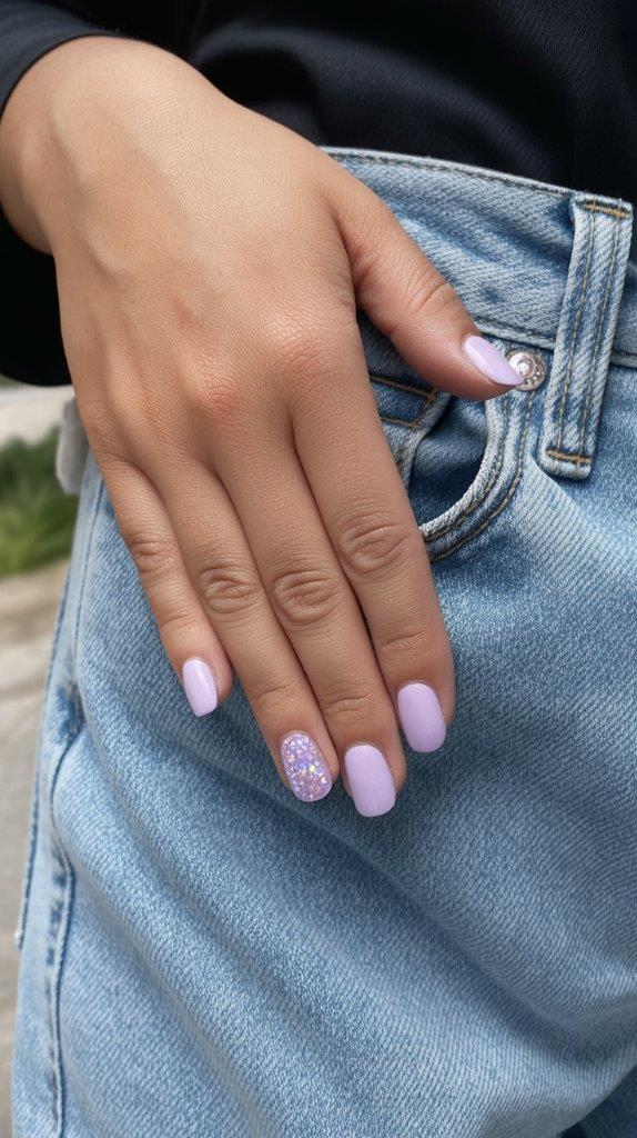 Sometimes, you just need a little sparkle. Paint all but one nail a solid pastel lavender. On your accent nail (ring fingers are the classic choice), go all out with a full coat of chunky lavender or holographic glitter. It’s balanced, easy to achieve, and satisfies that glitter craving perfectly.