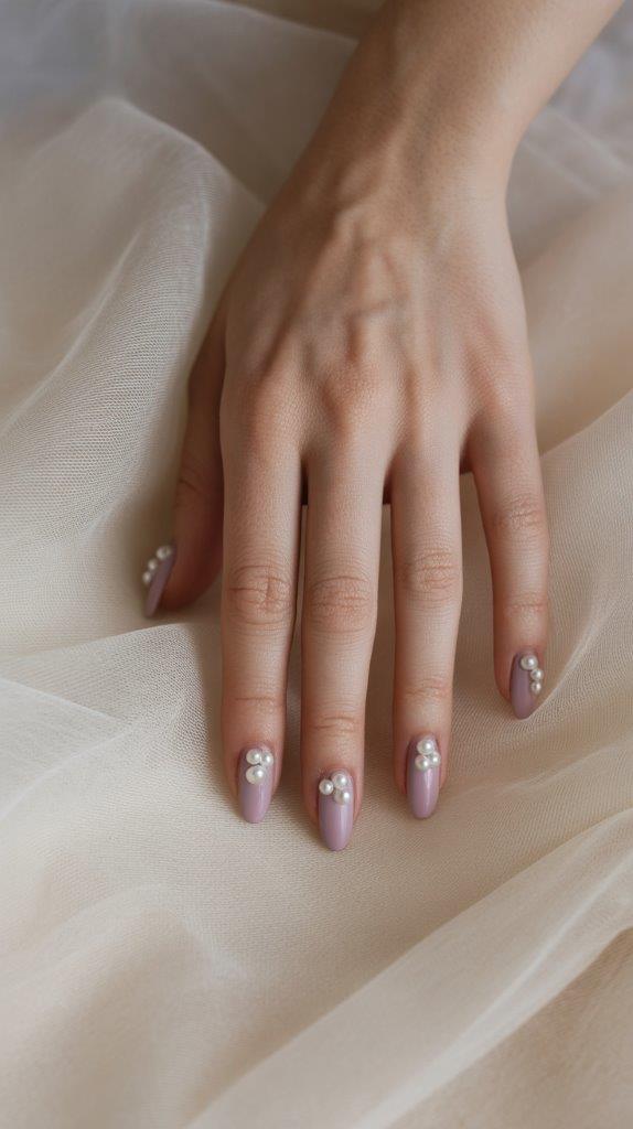 Tiny pearls or pearl-shaped studs are the perfect companion for a soft lavender base. Place a single pearl at the base of each nail, or create a delicate cluster on your ring finger. It’s bridal, elegant, and adds a 3D element that’s simply beautiful. Just be careful putting on your jeans!