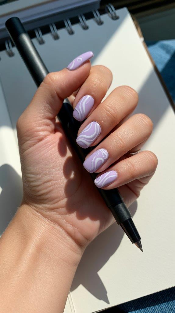 Let loose with some freehand swirling. Using a fine brush or a dotting tool, create whimsical, cloud-like swirls in white or cream over the lavender base. It doesn’t have to be perfect—the imperfection is what gives it character. This look is pure, joyful creativity.