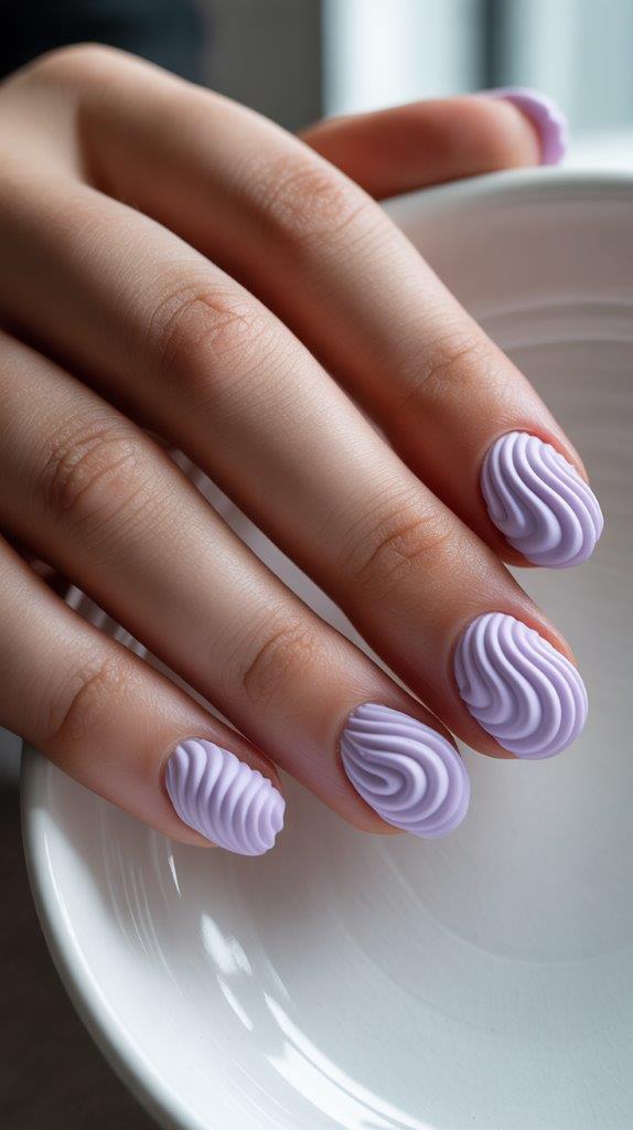 This one looks good enough to eat. Using a thick gel or acrylic, create textured, swirled peaks that look like the frosting on a cupcake. Keep the color a milky pastel lavender. It’s a bold 3D look that’s surprisingly wearable and will definitely start conversations.