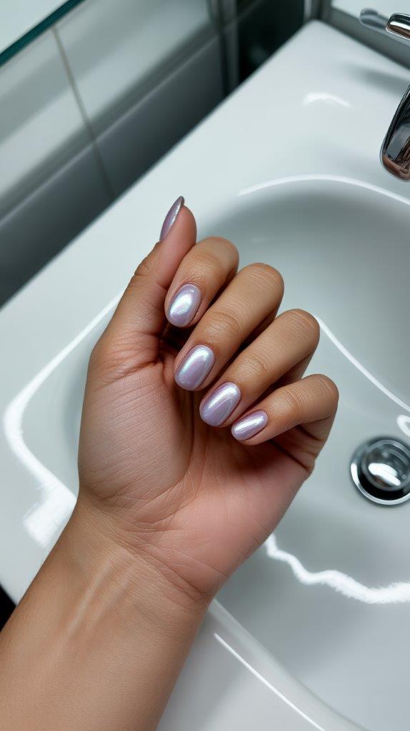 Thanks to Hailey Bieber, the glazed, pearlescent look is everywhere. Achieve it with a pastel lavender base and a sheer, pearly white top coat or a specific “glaze” effect polish. It gives your nails a wet-looking, glossy, and slightly opalescent finish that’s utterly addictive. The ultimate cool-girl manicure.