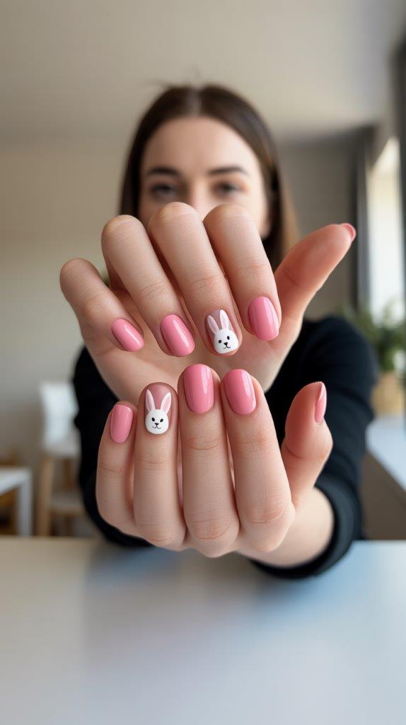 FYI, this design works best when the bunny nails are outnumbered by solid pink nails. One or two accent nails maximum keeps the look balanced.