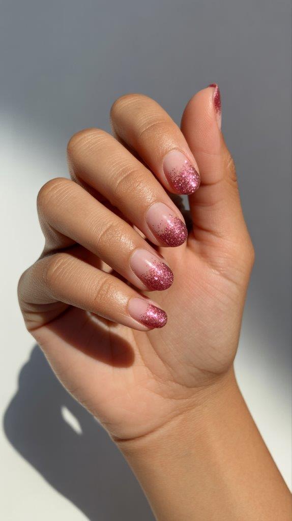 Start with a pink base and add glitter from the tips fading toward the cuticle. Just enough sparkle to catch light without looking like a disco ball.