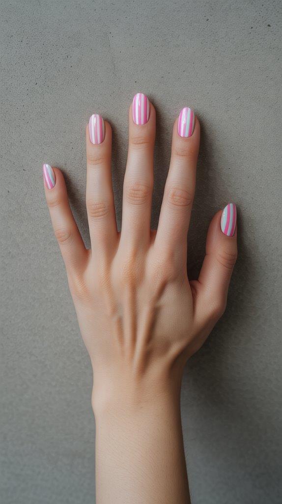 Use striping tape for clean lines, or freehand if you’re feeling confident. Try alternating hot pink and baby pink, or pink and lavender for contrast. The stripes create an elongating effect that makes nails look longer.