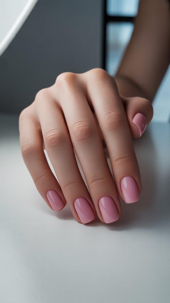 Pink shows imperfections more than darker colors, so proper prep is crucial. Push back cuticles, buff your nail surface lightly, and use a good base coat.