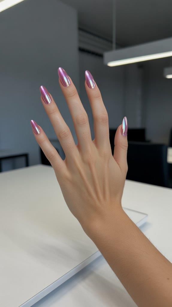 Apply chrome powder over a pink base for that iridescent, mirror-like effect that’s absolutely stunning.