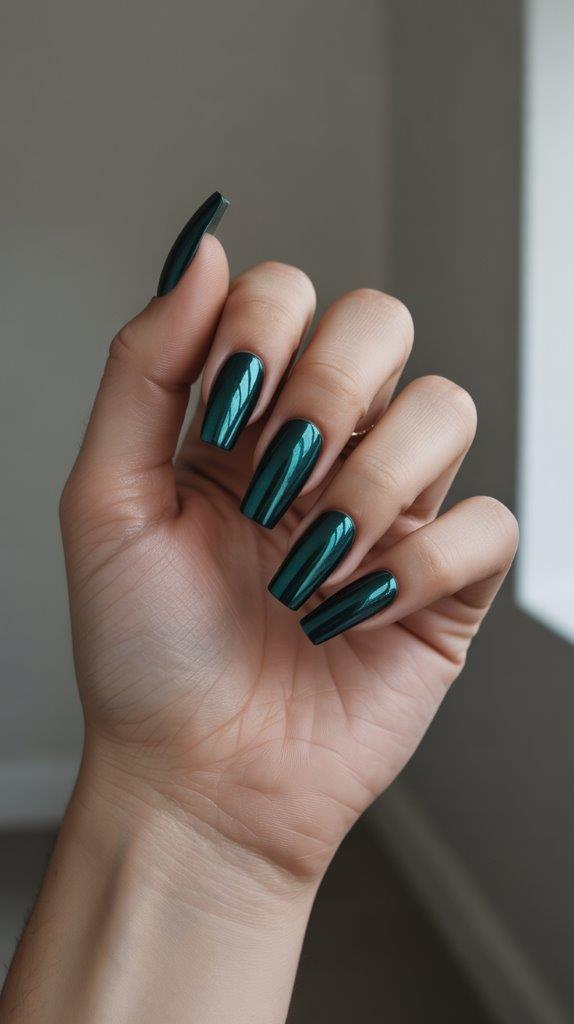 Why match when you can mesmerize? A deep emerald chrome manicure takes your green dress and launches it into another dimension. The metallic, liquid-like finish catches the light from every angle, creating a hypnotic effect with every gesture.
