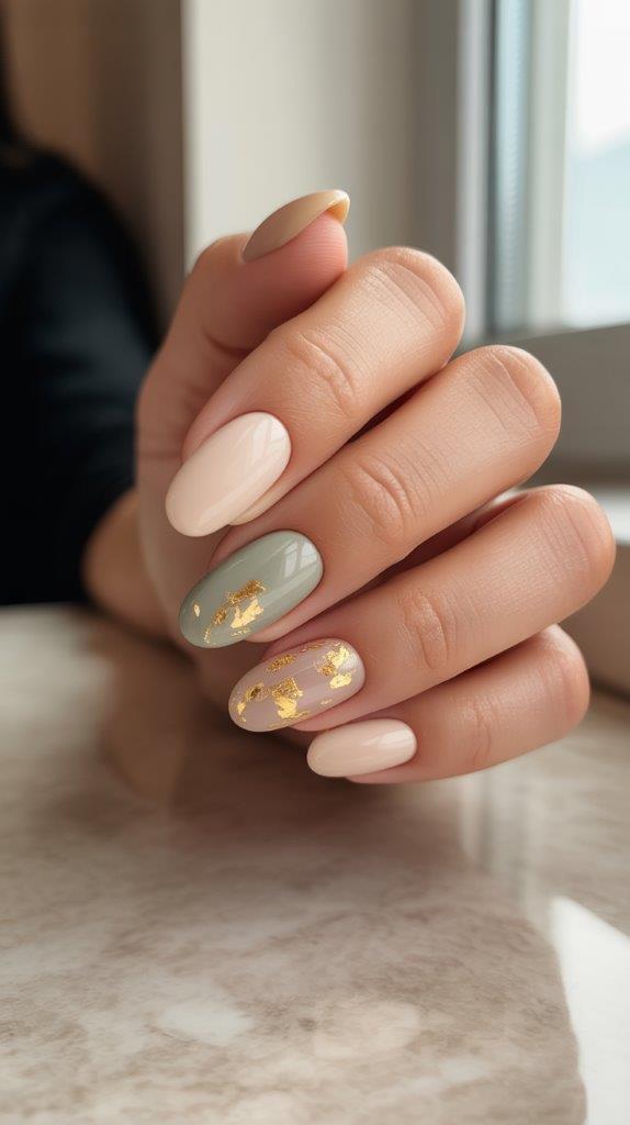 Green and gold is a classic, regal combination for a reason. It just works. For this look, paint most of your nails in a creamy, sophisticated nude or a soft sage. Then, go all out with one or two accent nails adorned in lavish gold foil.