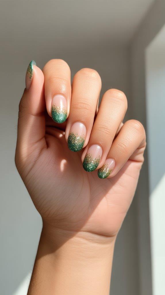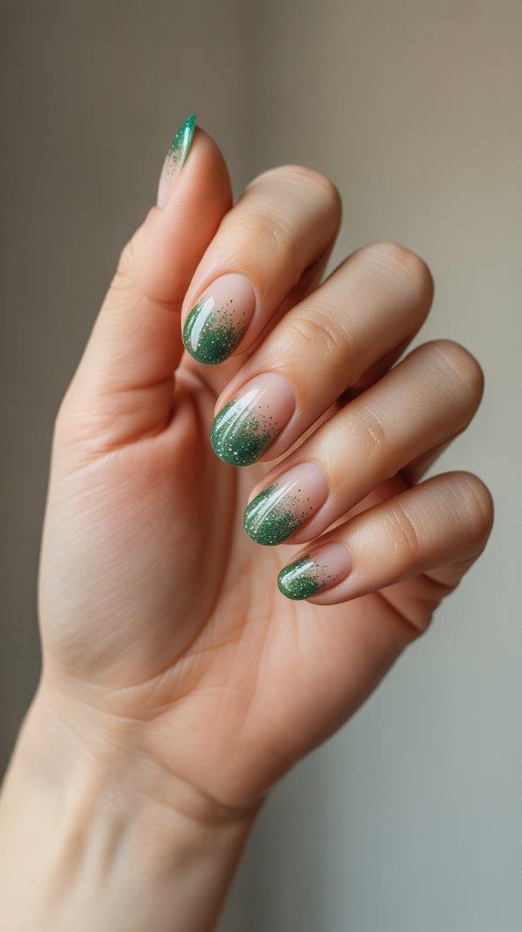 Can’t decide between solid color and full-on sparkle? A gradient is your answer. Start with an opaque green at your cuticles that seamlessly fades into a glitter bomb at the tips. It’s like your nails are erupting in celebration.