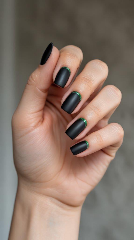 5. Matte Black with a Green Glitter Cuticle