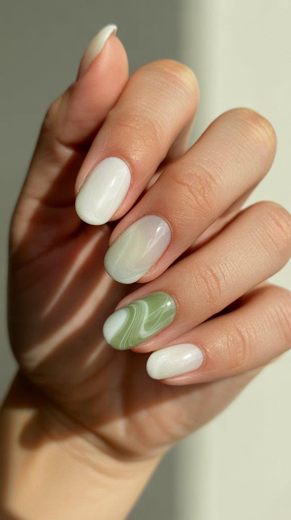 Clean, fresh, and utterly elegant. A milky, semi-sheer white base looks expensive and clean on its own. Add one or two accent nails with a green and white marble swirl, mimicking the look of luxurious stone.