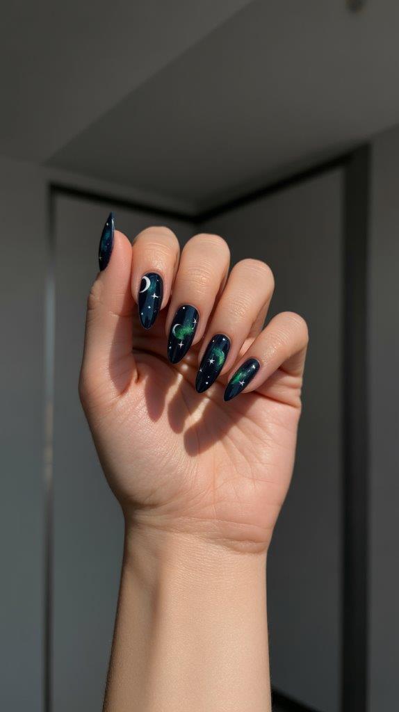 Channel the night sky for your big night. A dark navy or even black base gets transformed with tiny stars, moons, and a hint of shimmering green nebula clouds. It’s whimsical, dreamy, and totally Instagram-worthy.
