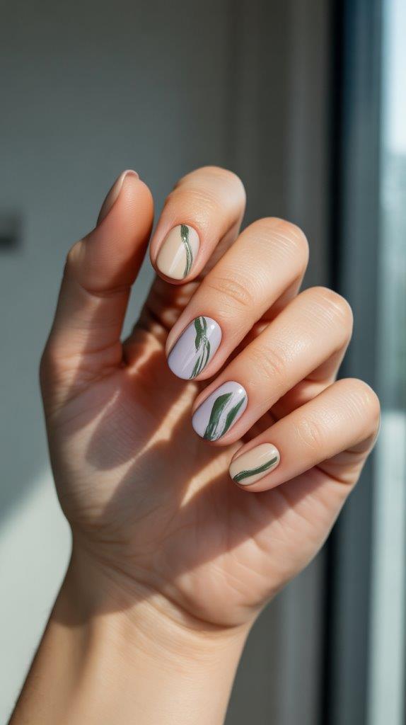 Embrace your inner artist. This design features a neutral base—think beige, grey, or pale lavender—with careless, painterly strokes of your dress’s green across each nail. No two nails are exactly alike, making it uniquely yours.