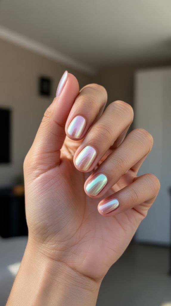 Capture the otherworldly shimmer of an opal stone. This manicure uses special iridescent powders or polishes that shift between soft pink, blue, and green hues. It’s ethereal, magical, and complements green without directly matching it.