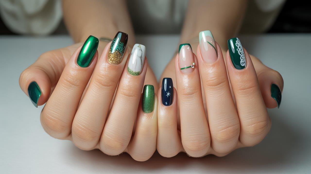 This look is for the confident trendsetter. It’s bold, glamorous in an old-Hollywood way, and guarantees you won’t blend into the background. It works best with a solid green dress, letting your nails and gown have a vibrant dialogue.