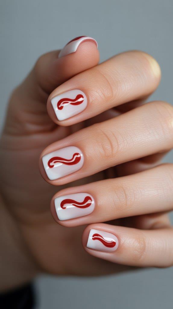 Picture this: a crisp, white base on your nails. Now, imagine a single, playful red squiggle dancing across each one. It’s modern, artistic, and has this effortless cool-girl energy. I tried this last year, and it was surprisingly easy to do with a thin brush. Plus, squiggles are way more forgiving than straight lines—a total win for us shaky-handed folks!