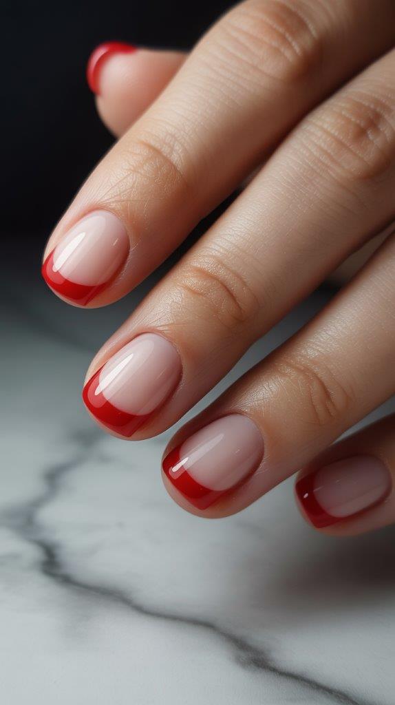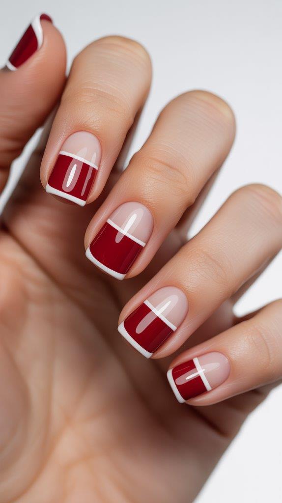 Instead of a thin tip, paint the entire tip of your nail in a bold block of red, with a crisp white line separating it from the bare or white base. It’s graphic, modern, and seriously cool.