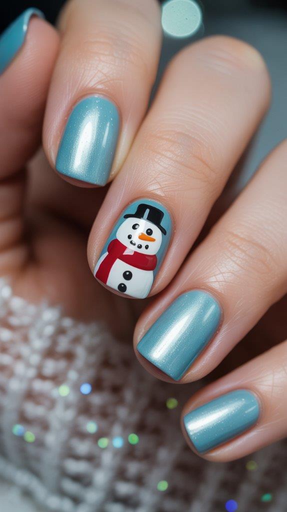 A light blue or sheer glitter base sets the perfect snowy scene for a cute little snowman on your accent nail. A dotting tool is your best friend for creating the perfect coal eyes and carrot nose. Don’t forget his little stick arms! This one always makes me smile.