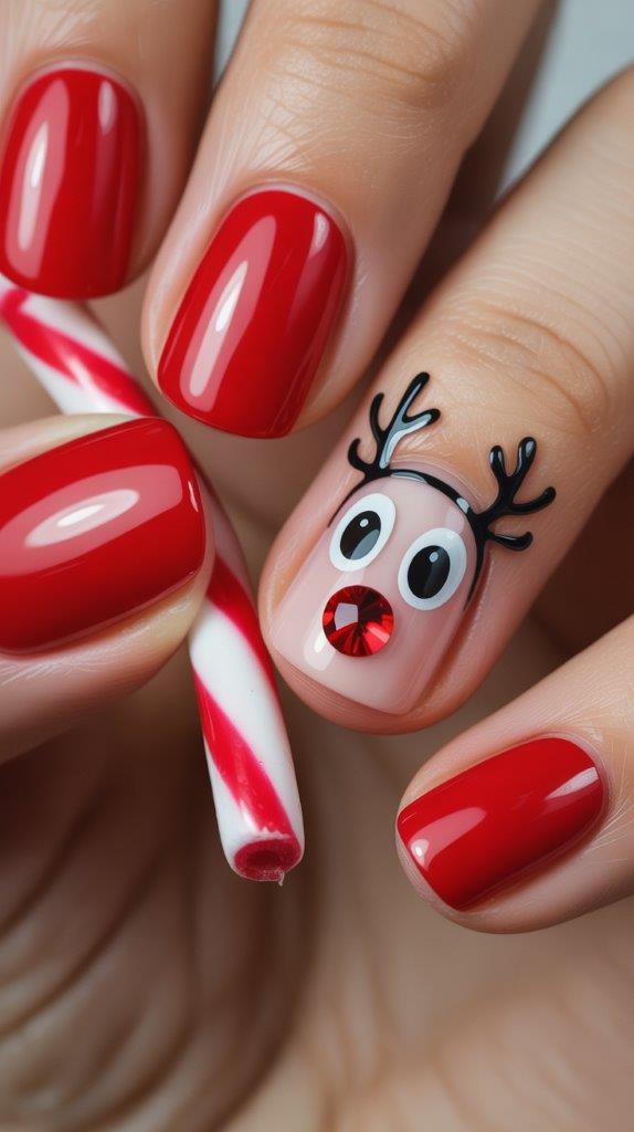 A glossy red base is all you need for Rudolph’s face. Use a fine brush or a toothpick to add his adorable antlers and big, googly eyes. You can even add a tiny, shiny rhinestone for his famous red nose. So cute, it’s almost criminal.