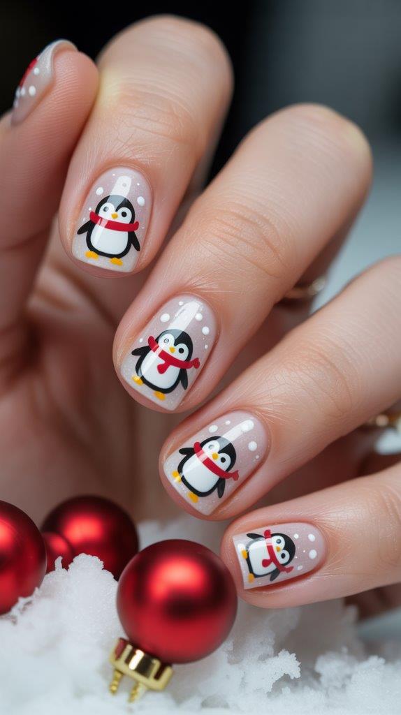 Why are penguins so Christmassy? Who knows, but we love them. A black and white penguin body with a little red scarf on a white snowy base is just too much fun. This one takes a steady hand, but the result is so worth it.