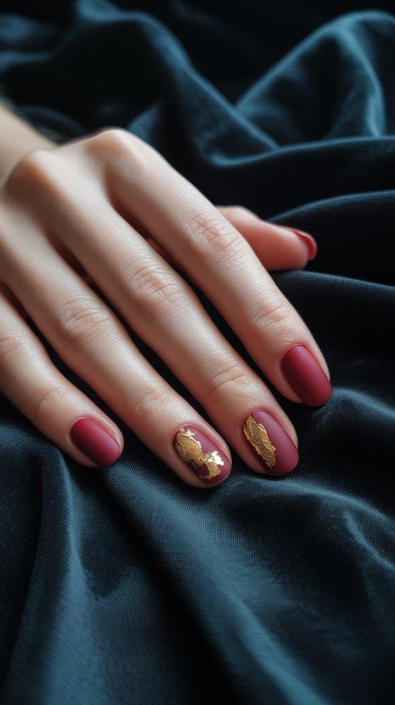 A deep, matte red that looks just like red velvet cake. IMO, this is the chicest red. Then, add tiny, delicate gold leaf flakes to one or two nails. It’s luxurious, it’s rich, and it pairs perfectly with a glass of champagne.