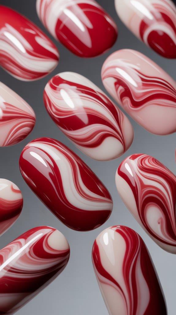 Swirls of red and white created with a water marbling technique or even just a careful brush create a stunning, one-of-a-kind marble effect. No two nails will be exactly alike, making your manicure a true original. It gives off major “ice queen” vibes in the best way possible.