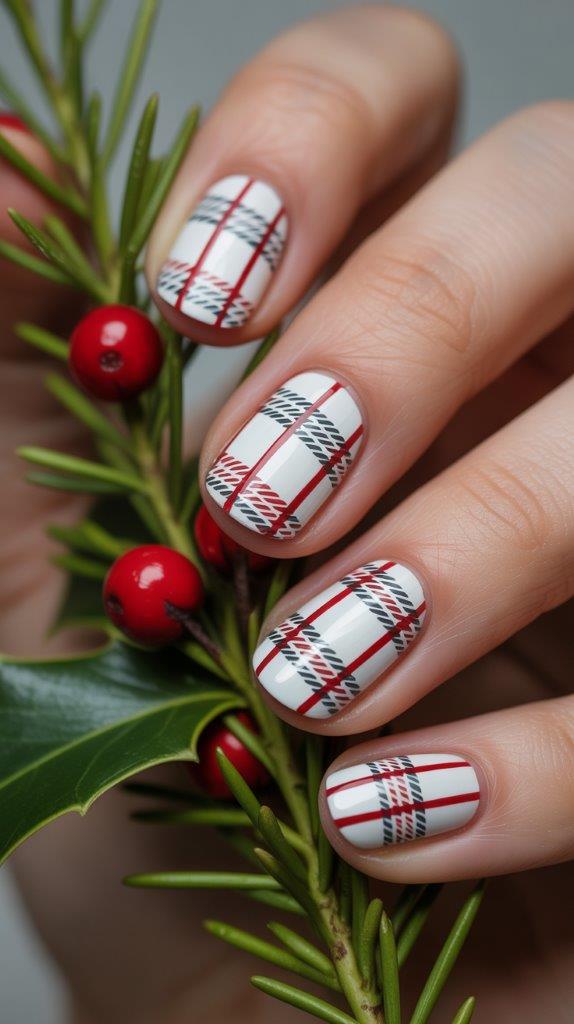 Channel your inner lumberjack with a chic plaid design. It’s easier than it looks! Start with a white base, then use a thin brush to create a grid of red lines. Add some smaller, intersecting lines, and boom—you’ve got a cozy, festive pattern that’s totally timeless.