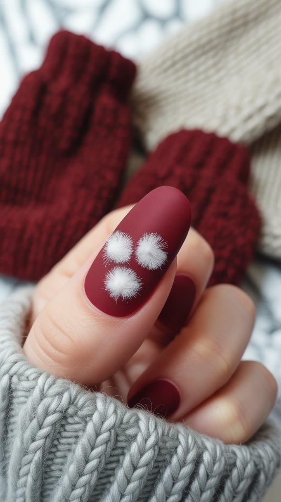 A matte, deep red polish can sometimes have a velvety appearance. Lean into it! Add a few tiny white pompoms (using 3D nail art) on an accent nail to really sell the mitten effect. So tactile and fun!