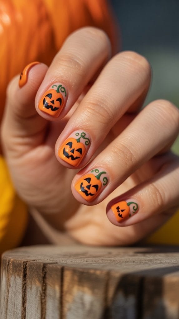Let’s kick things off with a Halloween staple: pumpkins! 🎃 Short nails can still pack a big punch with bright orange polish and tiny pumpkin decals. You can even add some green vine detailing for a little extra flair. This look is perfect for anyone who loves the traditional side of Halloween and wants their nails to reflect that festive spirit.