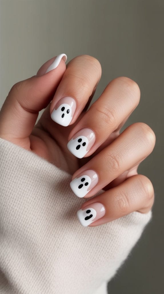 Boo! 👻 These ghostly white tips are a chic and simple way to get into the Halloween spirit. Start with a nude base and add white tips to create the appearance of spooky ghosts peeking over your nails. Add little black eyes and a wavy mouth for that classic ghost face. This design is perfect for a minimalist approach that still screams Halloween.