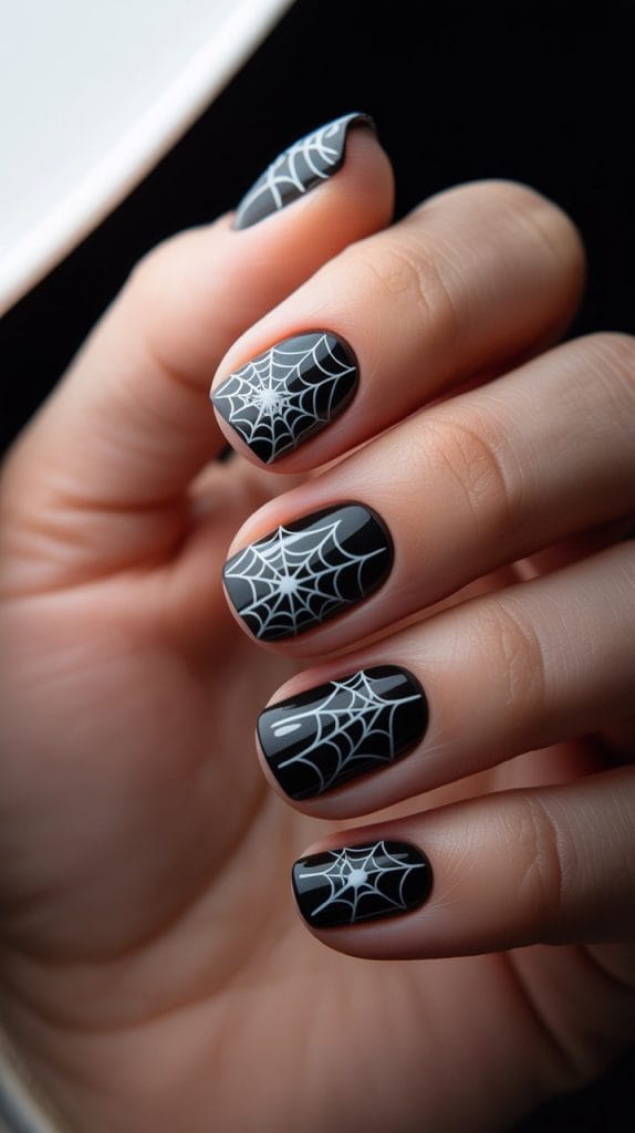 Capture the essence of a haunted house with delicate spider web designs on a black or dark purple base. This intricate pattern can be created using a thin nail brush or nail art pen. The best part? You can customize your webs with glitter or add little spider decals for an extra creepy touch.