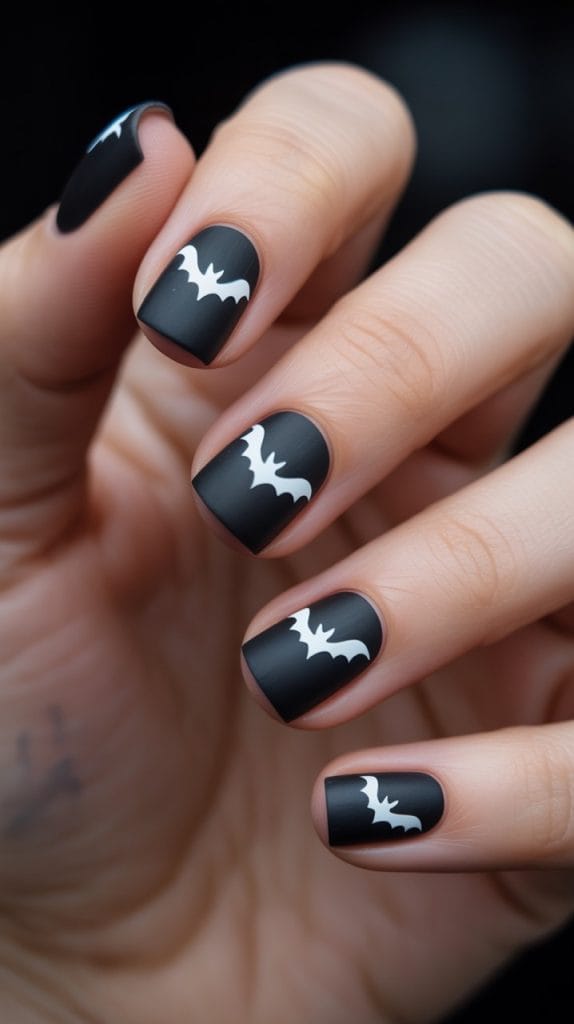 Let bats take flight across your nails with this spooky design. A black matte base serves as the perfect canvas for tiny white or silver bat silhouettes. This look is both sophisticated and eerie, ideal for a night out at a Halloween event.