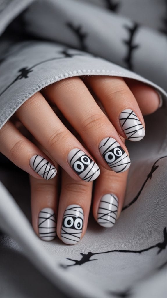 Wrap up your Halloween look with a mummy-inspired manicure. Use a light gray or beige base, and add crisscrossing white lines to mimic mummy bandages. Don’t forget the eyes! Add a couple of googly eye decals for a fun and quirky touch.