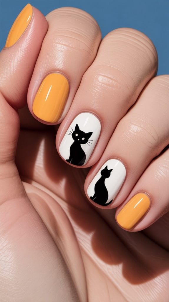 Black cats are a Halloween icon, and now they can be a part of your nail art too! A simple black cat silhouette on a white or orange background can add a playful and mysterious vibe to your look. This design is purr-fect for any cat lover out there.