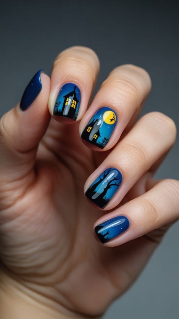 Create a mini haunted house scene on your nails with a dark blue or black base. Use yellow and orange to paint windows and a glowing moon, and add spooky silhouettes like trees or ghosts for an eerie effect. This intricate design is sure to impress and spook.