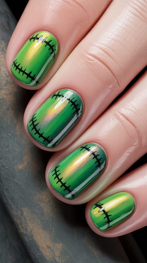 Embrace the classic horror icon with nails inspired by Frankenstein’s monster. A bright green base with black zigzag lines to mimic stitches will give you that iconic look. Add some silver bolts or studs for extra detail, creating a nail design that’s both scary and stylish.
