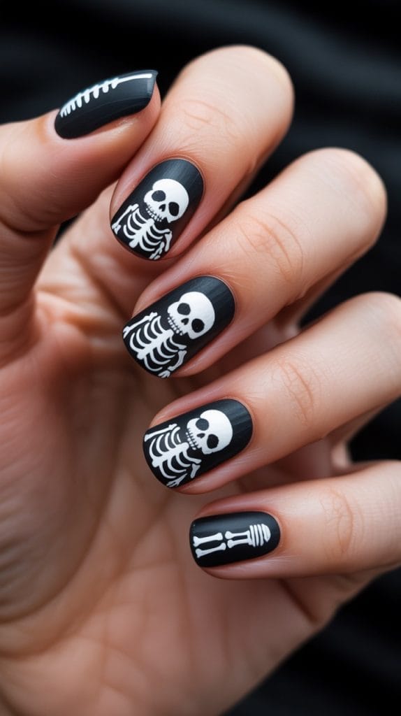 Bring a touch of elegance to the macabre with skeleton-themed nails. Use a black base and paint white skeleton hands or bones using a fine brush. This look can be as detailed or minimal as you like, making it a versatile choice for any Halloween event.