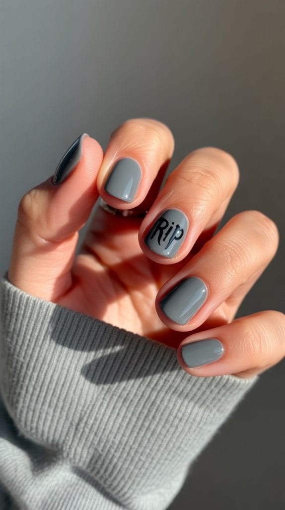 Capture the somber spirit of a graveyard with a tombstone gray polish. Add black lettering or numbers to mimic the look of gravestones, or enhance with some moss green details for an authentic touch. This look is perfect for those who enjoy a more understated Halloween style.