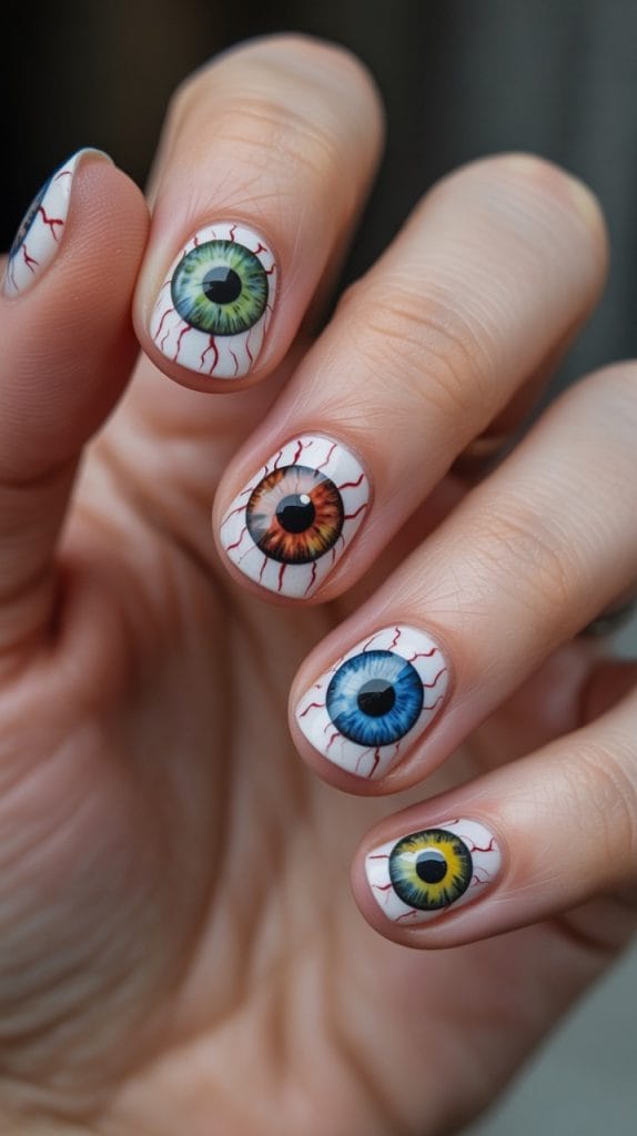 Keep an eye on things with a spooky eyeball design. Use a white base and add colorful irises and red veins for a realistic effect. This design is both creepy and fun, ensuring your nails are the center of attention this Halloween.