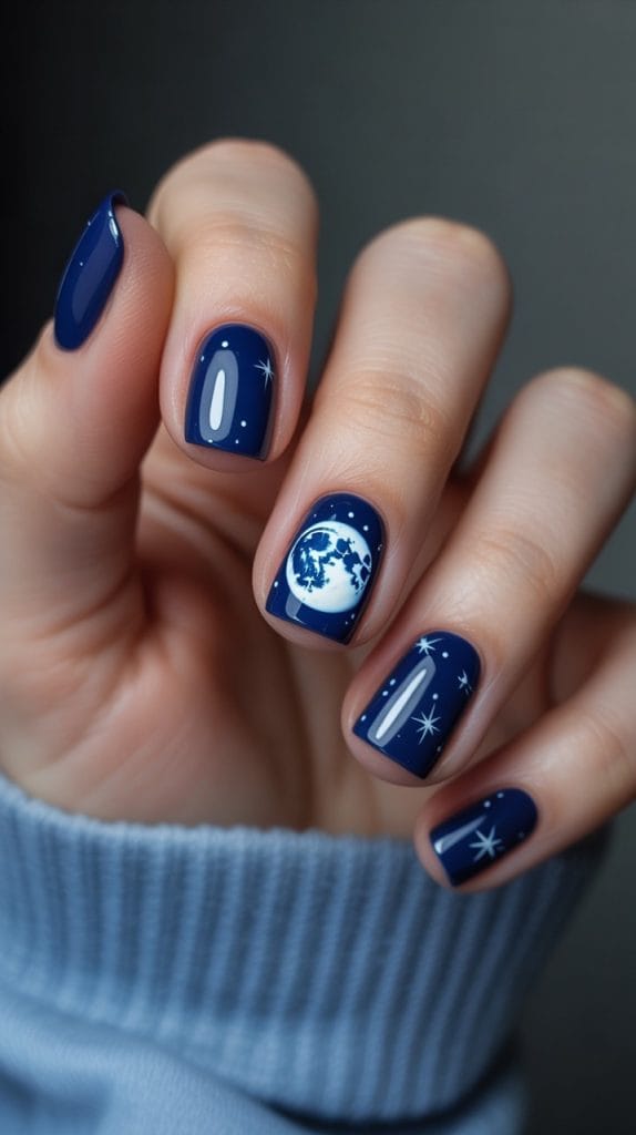 Capture the mystery of a full moon with this celestial nail design. Use a deep blue or black base and paint a glowing full moon on one or two accent nails. Add some star or cloud details for extra depth and intrigue.