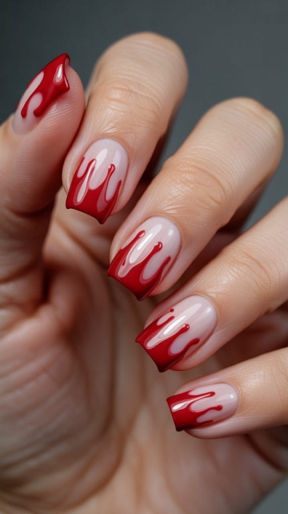 For a look that’s more on the gory side, try a blood-red drip design. Start with a nude or pale pink base, and use a deep red polish to create the effect of blood dripping down from the tips. It’s a bold and edgy choice that’s perfect for a killer Halloween party.