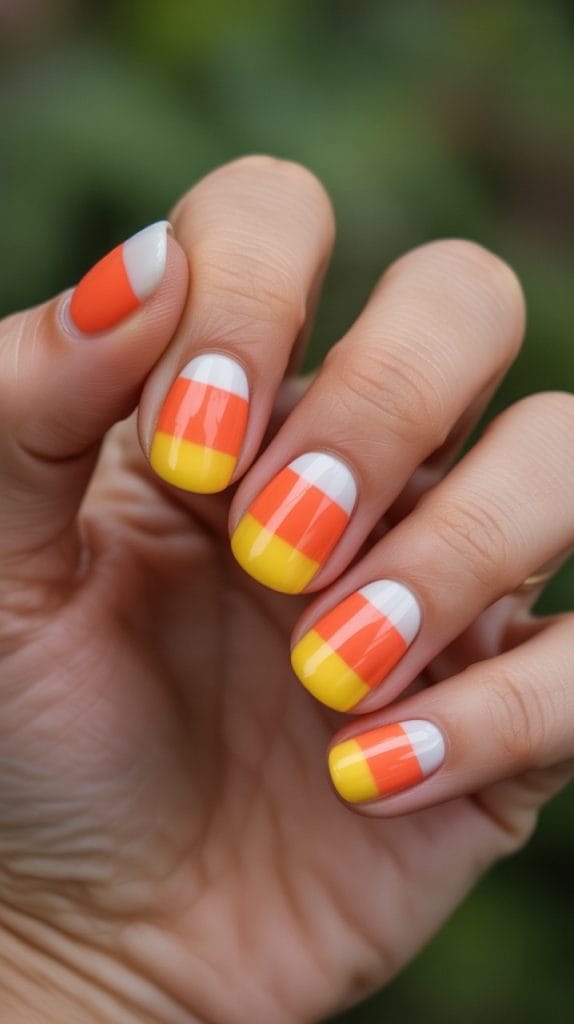 Sweeten up your Halloween look with candy corn-inspired nails! 🍬 Use white, orange, and yellow polishes in a striped pattern to mimic this iconic Halloween treat. This design is fun, festive, and perfect for those who love a pop of color on their nails.