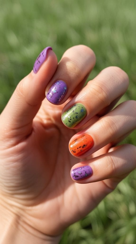 Channel some magical vibes with a mix of purple, green, and orange hues. Use a different color on each nail or blend them together for a mystical ombre effect. Add some glitter for extra sparkle, and you’ve got a look that’s as enchanting as it is festive.