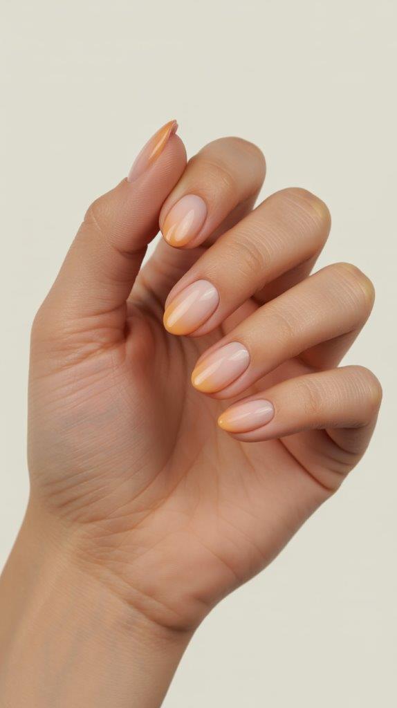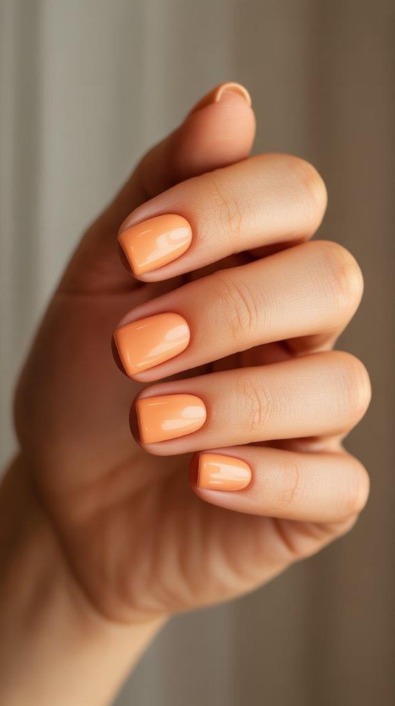Warm peach on short squoval nails (square with rounded corners) is flattering on every skin tone. The squoval shape is the most universally flattering, and peach adds warmth without being too bold. This combination is practically foolproof.