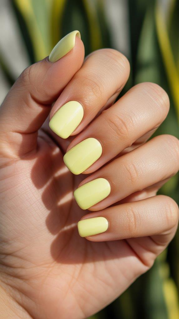 Pale butter yellow on short square nails is optimistic and cheerful. The square shape gives yellow some structure, preventing it from washing you out. Yellow is tricky, but this approach makes it wearable.
