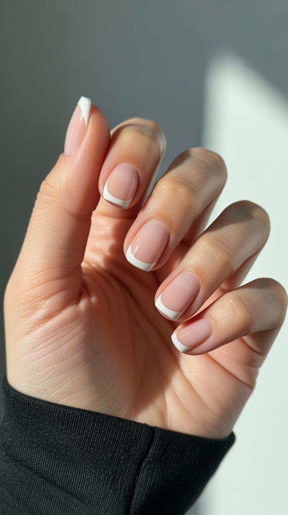 Classic French but with thinner white tips proportioned for short nails. The key is keeping tips narrow—thick tips overwhelm short nails. This updated proportion makes French manicures work beautifully on shorter lengths.